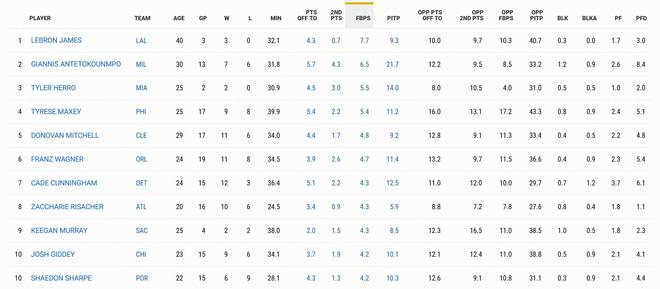 詹姆斯本赛季代表湖人出战3场常规赛,场均登场32分钟得到17.7分5篮板8.7助攻,据NBA官网数据统计显示,詹姆斯的场均FBPS(fast break points快攻得分)为7.7分,超越字母哥的6.5分排名全联盟第一。